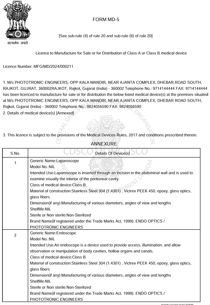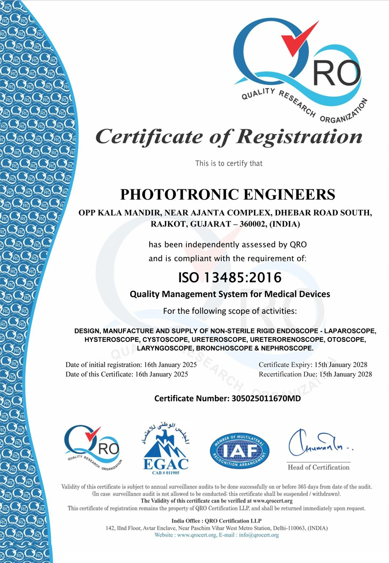 Our endoscopes are registered with the Central Drugs Standard Control Organization (CDSCO) in compliance with the Medical Device Rules, 2017 and our company is ISO 13485:2016 certified.